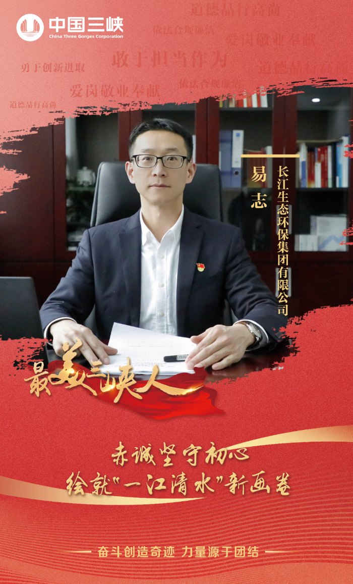 2016年,習近平總書記提出“共抓大保護,不搞大開發”,勾畫出了推動長江經濟帶生態優先、綠色發展的宏偉藍圖。易志主動請纓從大水電轉戰大保護,順江而下1000多公里,以水電人釘釘子的精神,安全高效建成九江防汛“第一壩”,化解百川入湖之險;為十里河“掃黑除臭”,幫九江百姓找回“家門口的幸福河”。2021年,易志作為主要負責人帶領九江三峽水環境公司榮獲全國五一勞動獎狀、全國引領性勞動競賽先進集體稱號;江西省委省政府授予易志“生態文明建設先進個人”榮譽稱號。